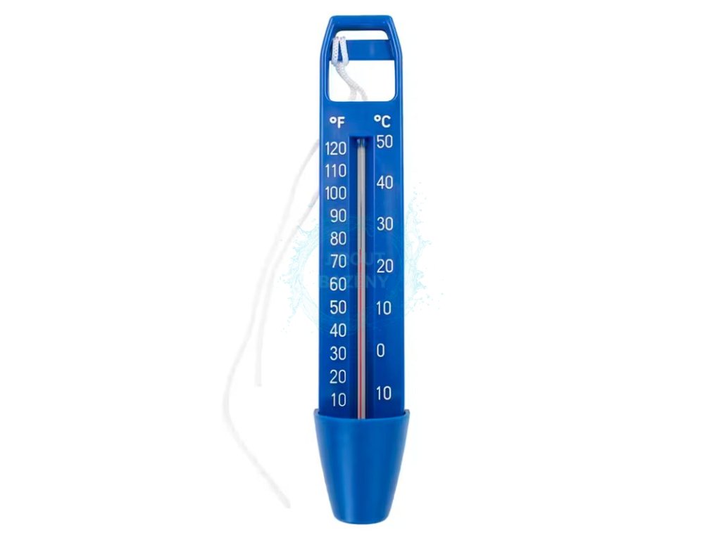Bazénový teploměr ponorný - neplovoucí. Teploměr do bazénu nebo vířivky spolehlivě upevníte pomocí provázku. Teploměr měří teplotu v rozsahu 0 - 50 °C. Délka teploměru je 25 cm.