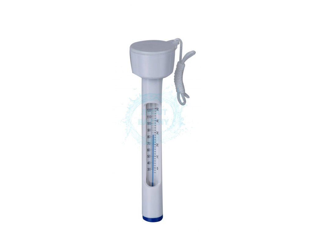 Bazénový teploměr s plastovým plovákem - bójkou. Teploměr do bazénu nebo do vířivky spolehlivě upevníte pomocí provázku. Teploměr měří teplotu v rozsahu 0 - 50 °C. Délka teploměru je 22 cm.