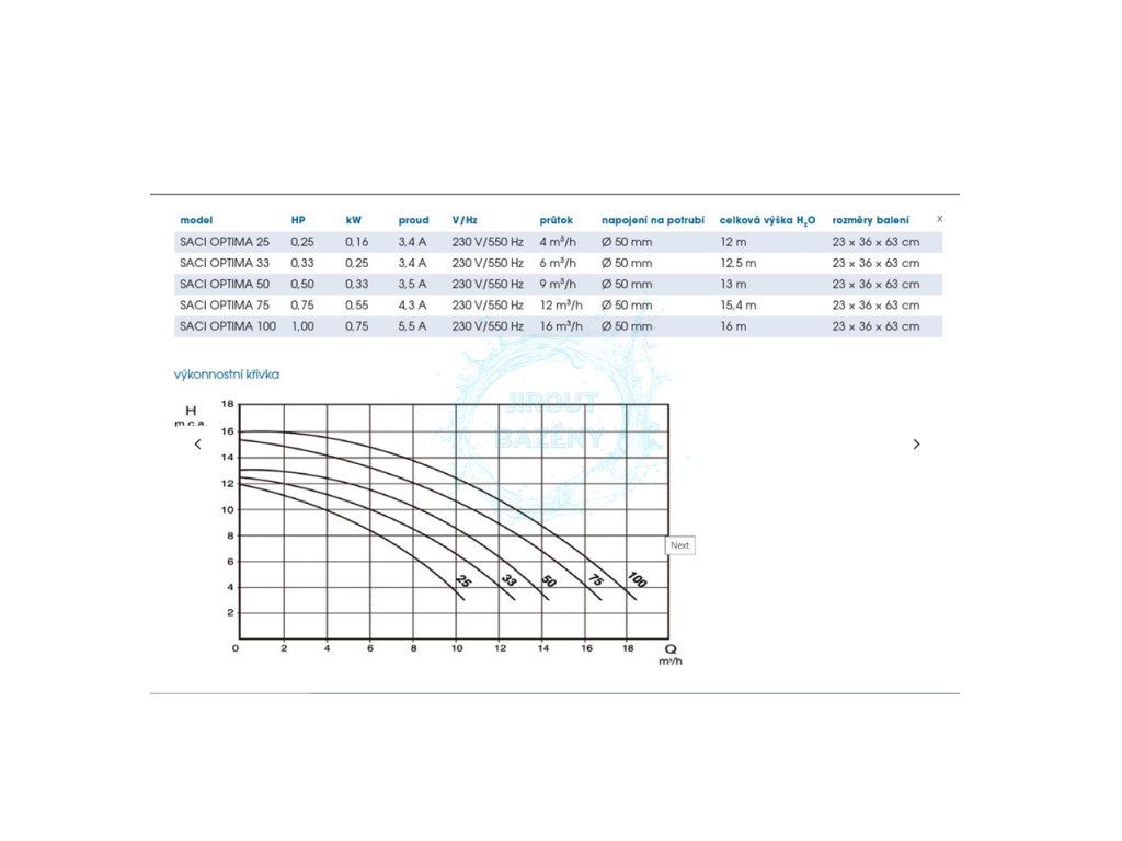 Optima je čerpadlo se samonasávací funkcí s předfiltrem velké kapacity. Vyrábí BOMBAS SACI, Španělsko. Testováno 100% všech čerpadel. S dodávkou je předán i technický a zkušební list s hodnotami během testování.