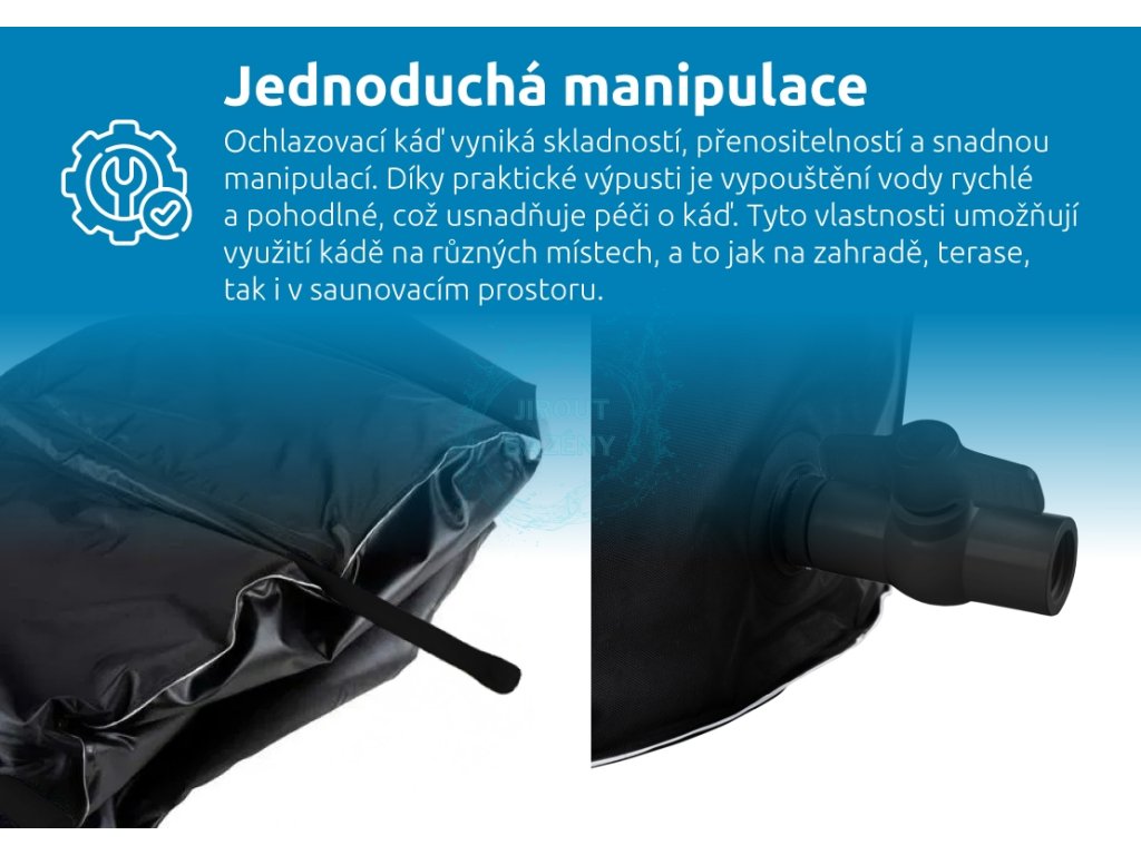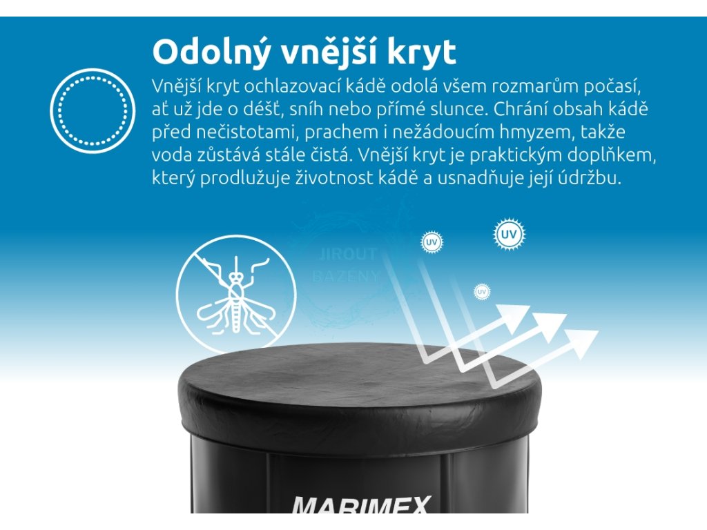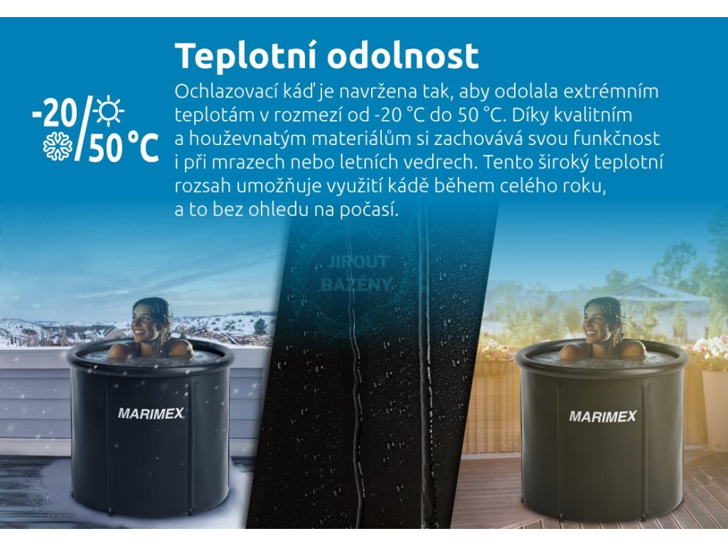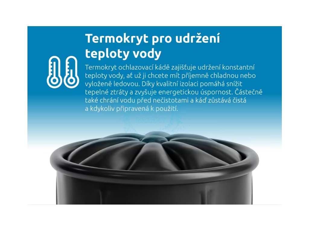 Materiál je odolný vůči teplotám -20 °C až 50 °C. Vnější kryt chrání káď před nečistotami, prachem a hmyzem. Termokryt navíc udržuje optimální teplotu vody, minimalizuje tepelné ztráty a zvyšuje energetickou úspornost. Tyto vlastnosti společně s jednoduchou manipulací dělají z ochlazovací kádě ideálního společníka na zahradu, terasu i do saunovacího prostoru.