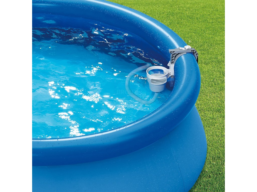 Skimmer upevníte na nafukovací límec nebo pomocí výměnného držáku na rámový bazén. Propojovací hadicí spojíte skimmer s bazénovou tryskou (sací), kdy použijete přiložené adaptéry.