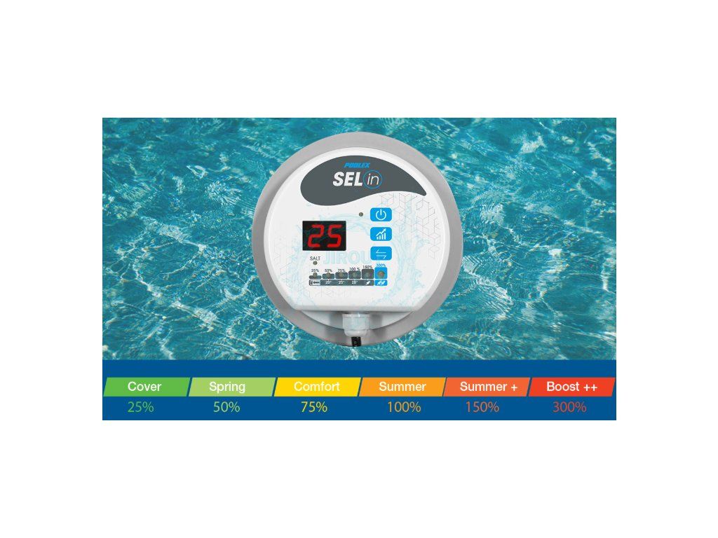Sel In nabízí 6 provozních režimů kalibrovaných podle teploty bazénové vody, včetně dvou režimů zesílení a manuálního režimu „krytí“ pouze v případě, že váš kryt zůstane na svém místě déle než 3 dny. Řada je k dispozici v 6 výrobních modelech od 4 g/h do 30 g/h pro bazény od 20 do 120 m3. Se Sel In je vhodný pro všechny majitele bazénů, nadzemních i zapuštěných.