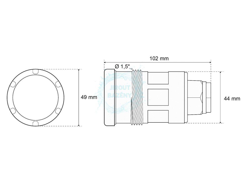 Světlo je určené k montáži do trysky se závitem 1,5“ na stěnu plastového bazénu nebo do schodů.